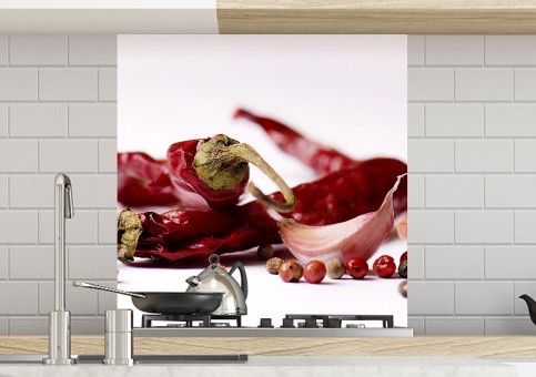 La crédence Poivre et piments est un élément esthétique indispensable de votre cuisine et se coordonne avec l’ensemble des autres éléments décoratifs. La crédence de cuisine Poivre et piments s’installe facilement entre le plan de travail et les meubles hauts. Elle protège le mur des éclaboussures de graisse ou d’eau et se nettoie avec une éponge.