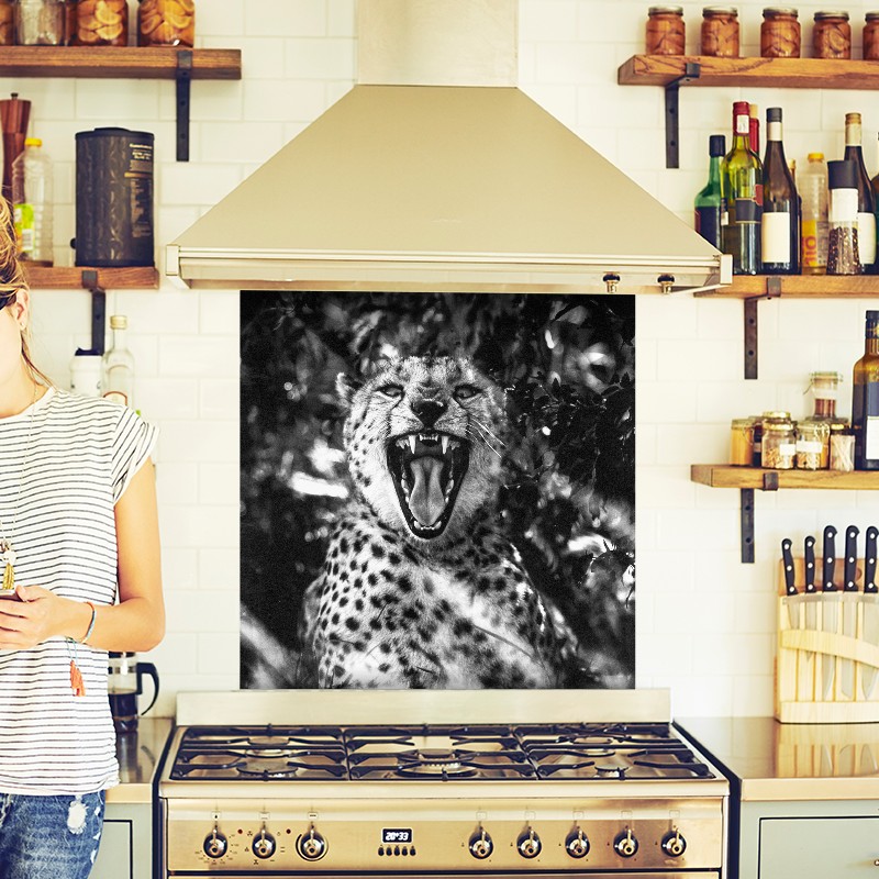 La crédence Portrait de Guépard est un élément esthétique indispensable de votre cuisine et se coordonne avec l’ensemble des autres éléments décoratifs. La crédence de cuisine Portrait de Guépard s’installe facilement entre le plan de travail et les meubles hauts. Elle protège le mur des éclaboussures de graisse ou d’eau et se nettoie avec une éponge.