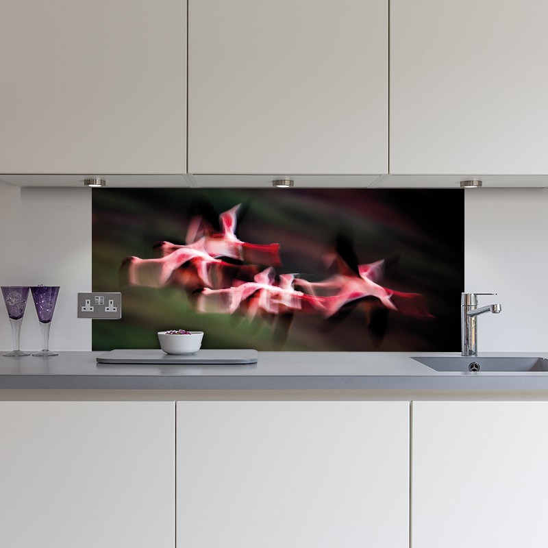 La crédence Vol de flamands est un élément esthétique indispensable de votre cuisine et se coordonne avec l’ensemble des autres éléments décoratifs. La crédence de cuisine Vol de flamands s’installe facilement entre le plan de travail et les meubles hauts. Elle protège le mur des éclaboussures de graisse ou d’eau et se nettoie avec une éponge.