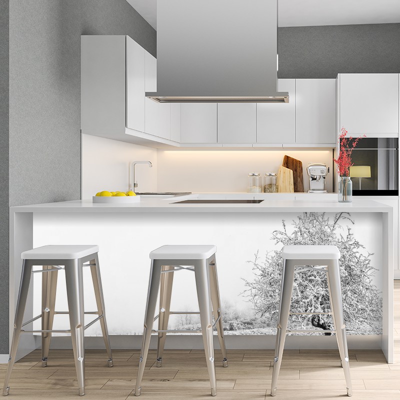 Grâce au-dessous de bar décoratif paysage de neige, non seulement vous habillez votre bar, mais vous le protégez contre les coups de pieds et les coups de chaises. Le dessous de bar décoratif paysage de neige est le partenaire idéal de la cuisine américaine.