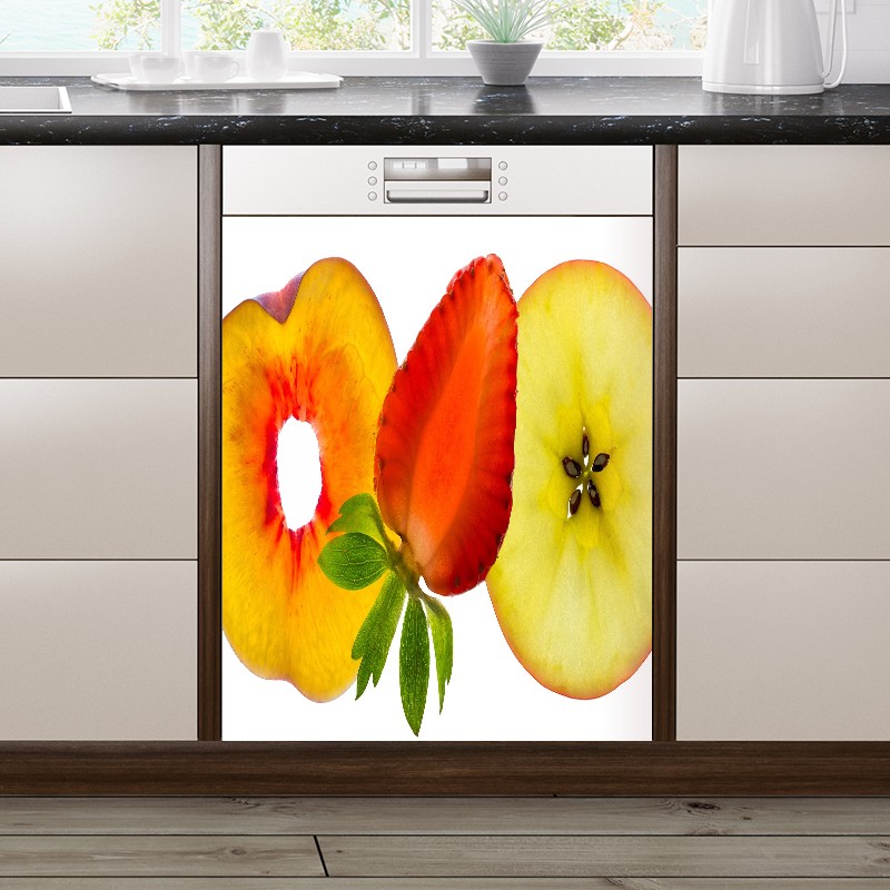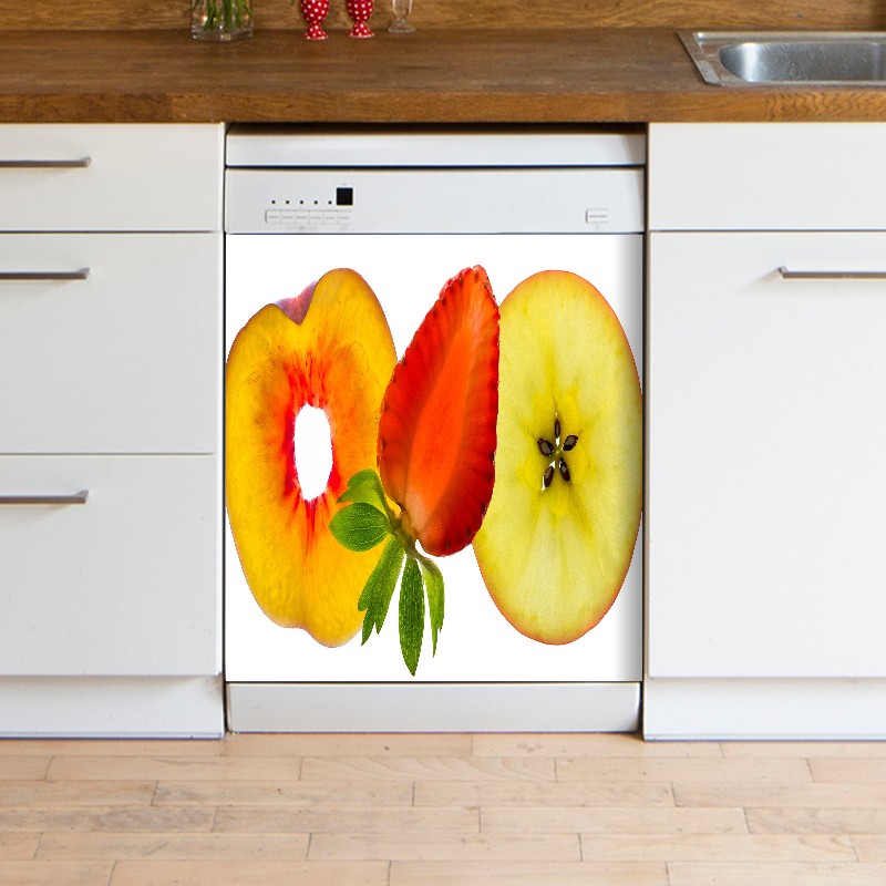 Le magnet grand format composition 3 fruits ajoute une dimension décor à tout support métallique comme une porte de lave-vaisselle ou de réfrigérateur.