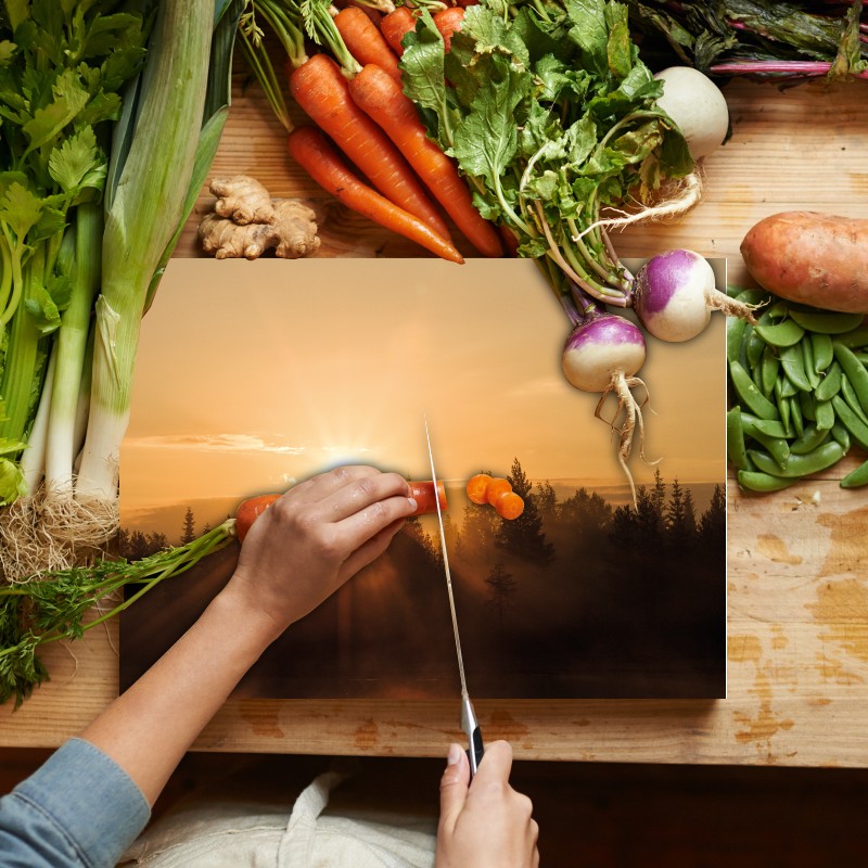 Pratique, la planche à découper coucher de soleil peut servir comme plat de service.